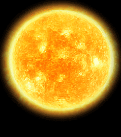 The Sun sits at the center and gives light and warmth to the whole solar system. It is a huge, glowing ball of gas that makes life possible on some worlds.